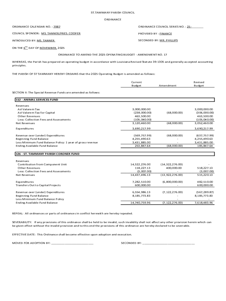 ST.TAMMANY PARISH COUNCIL ORDINANCE ORDINANCE CALENDAR NO. : 7987ORDINANCE COUNCIL SERIES NO. : 25___COUNCIL SPONSOR: MS. TANNER/PRES. COOPERPROVIDED BY : FINANCEINTRODUCED BY: MS. TANNERSECONDED