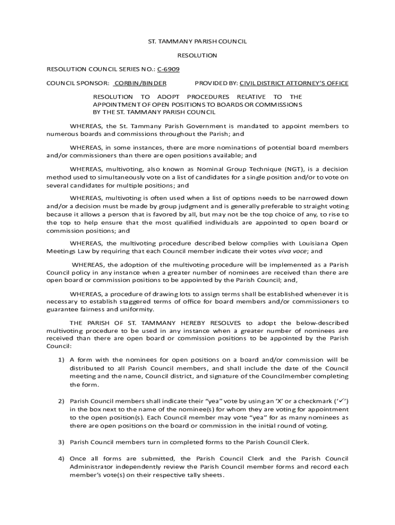 Get the free ST. TAMMANY PARISH COUNCIL RESOLUTION ...