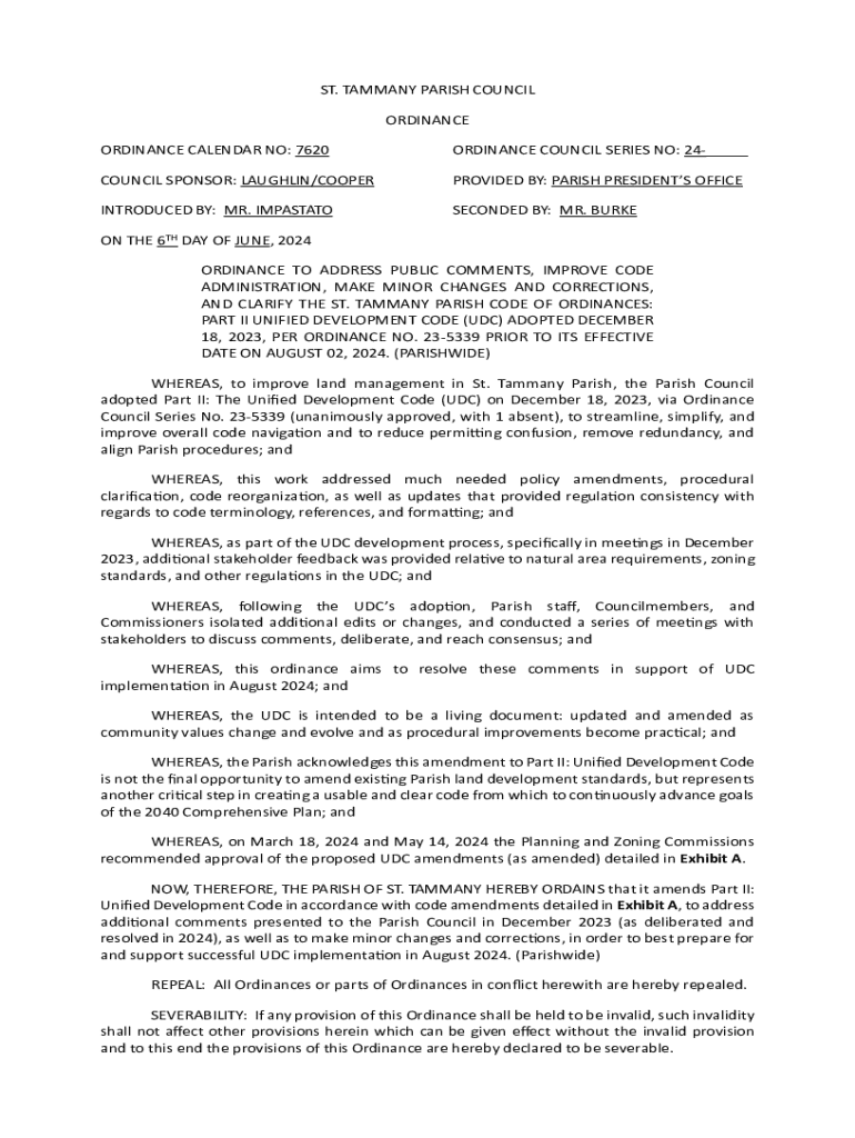 The Ordinance Calendar No. 7620 Form is a crucial document used primarily in urban planning and governance. It serves as a record for proposed legislative changes and developments that may affect community statutes in various jurisdictions. The form provides a structured manner to outline ordinances, ensuring all stakeholders are informed of ongoing legislative measures.