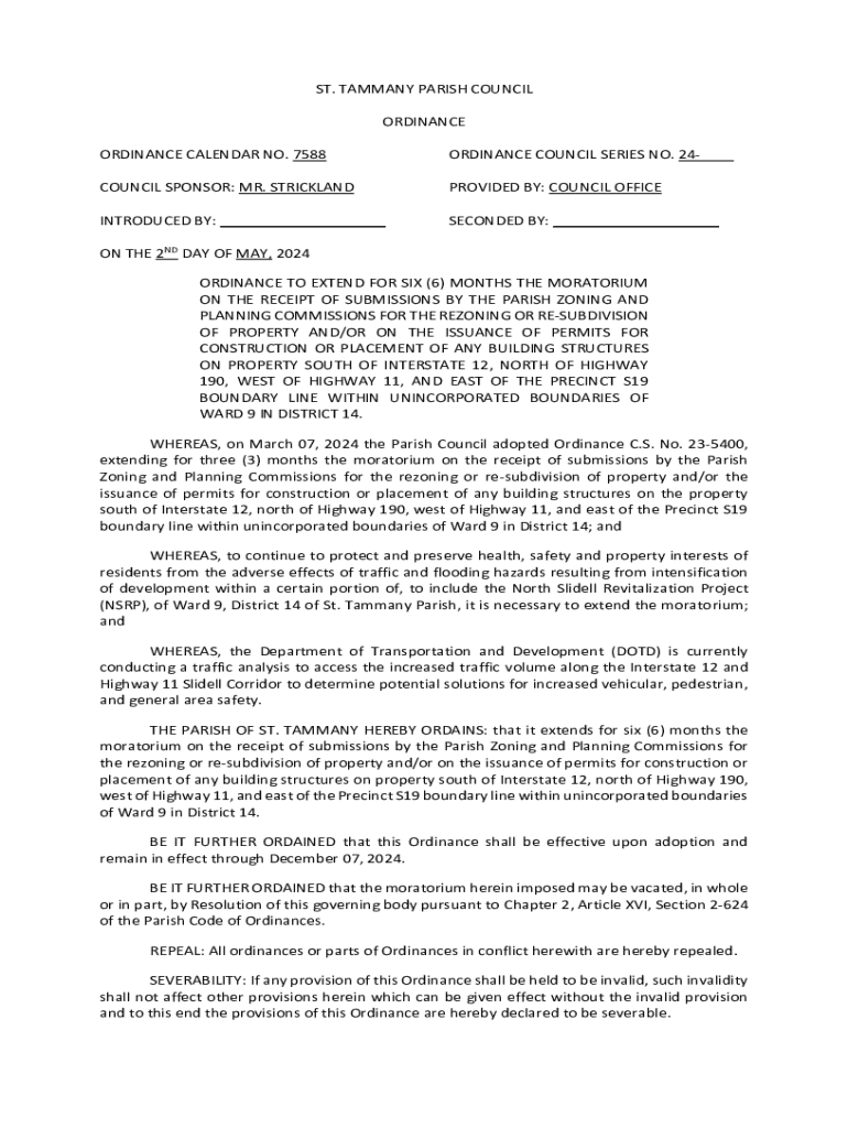 ST. TAMMANY PARISH COUNCIL ORDINANCE ORDINANCE CALENDAR NO. 7588ORDINANCE COUNCIL SERIES NO. 24___COUNCIL SPONSOR: MR. STRICKLANDPROVIDED BY: COUNCIL OFFICEINTRODUCED BY: ___SECONDED BY: ___ON THE