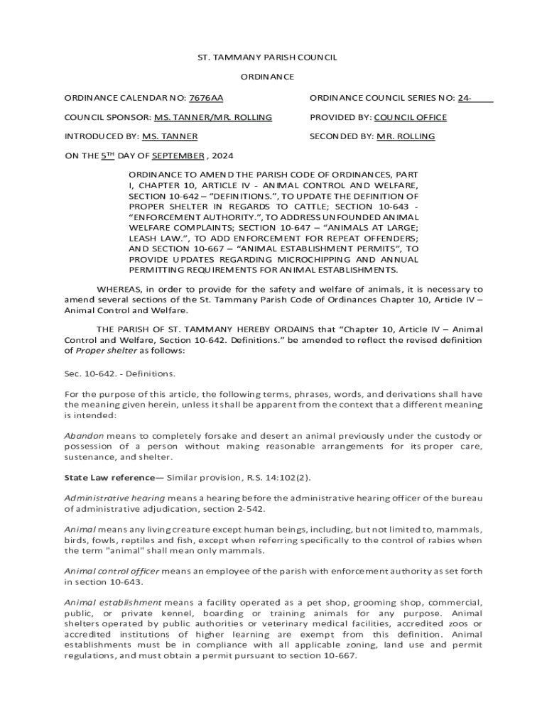 ST. TAMMANY PARISH COUNCIL ORDINANCE ORDINANCE CALENDAR NO: 7676AAORDINANCE COUNCIL SERIES NO: 24___COUNCIL SPONSOR: MS. TANNER/MR. ROLLINGPROVIDED BY: COUNCIL OFFICEINTRODUCED BY: MS. TANNERSECONDED
