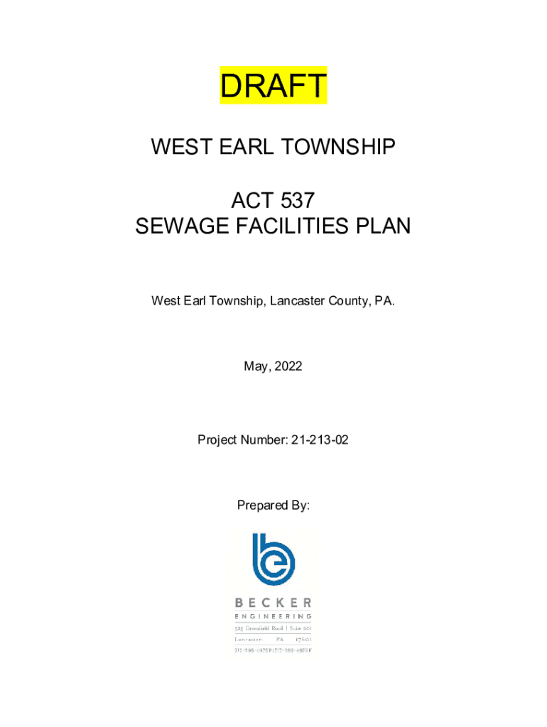 DRAFT WEST EARL TOWNSHIP ACT 537 SEWAGE FACILITIES PLANWest Earl Township, Lancaster County, PA.May, 2022Project Number: 2121302Prepared By:TABLE OF CONTENTSPage 1. GENERAL INFORMATION FORM112. ADMINISTRATIVE