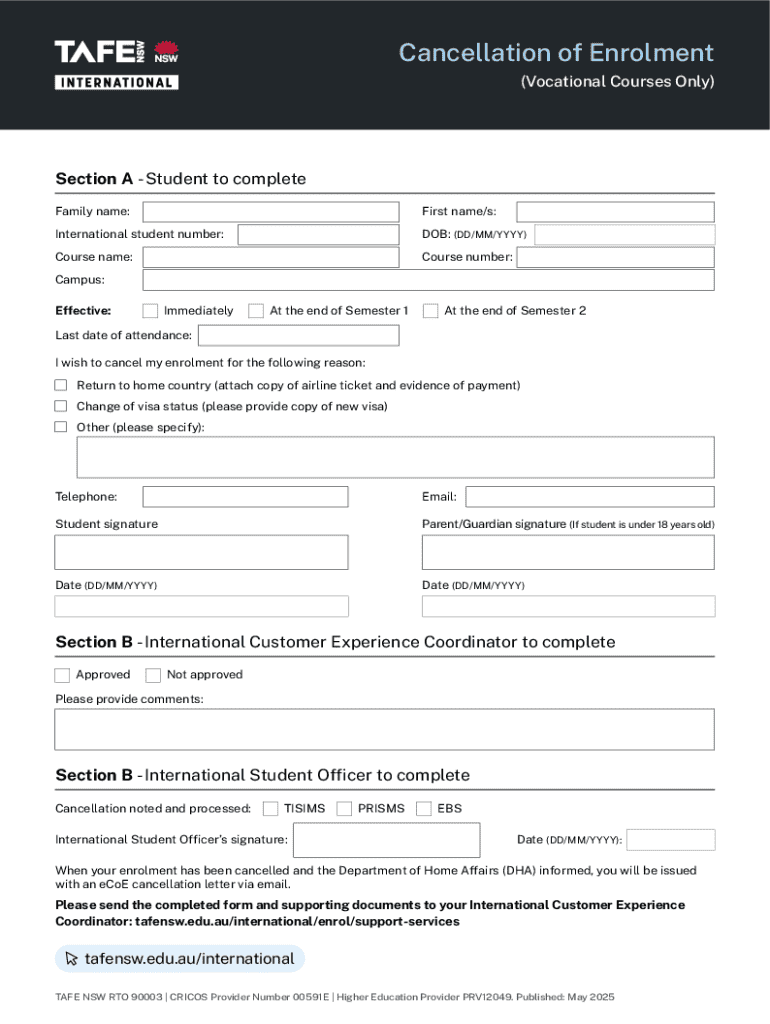 The process of cancellation can significantly impact your study journey at TAFE NSW, making it important to understand who needs to fill out the form. Generally, any international student wishing to terminate their enrollment due to personal or academic reasons is required to complete this form. Not only does it help in maintaining accurate student records, but it may also influence your eligibility for refunds or deferrals.