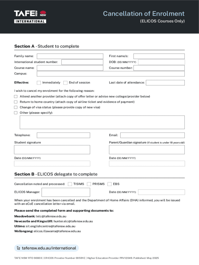 Get the free TAFE NSW International Cancellation of Enrolment (ELICOS courses only) form