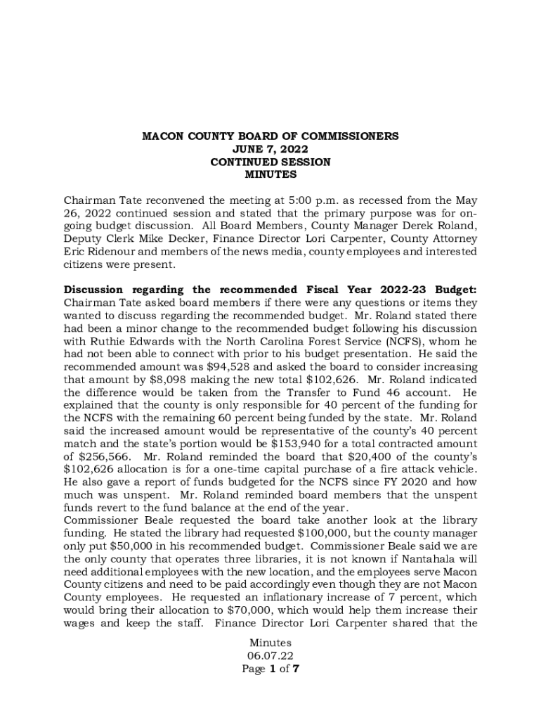 MACON COUNTY BOARD OF COMMISSIONERS JUNE 7, 2022 CONTINUED SESSION MINUTES Chairman Tate reconvened the meeting at 5:00 p.m. as recessed from the May 26, 2022 continued session and stated that the