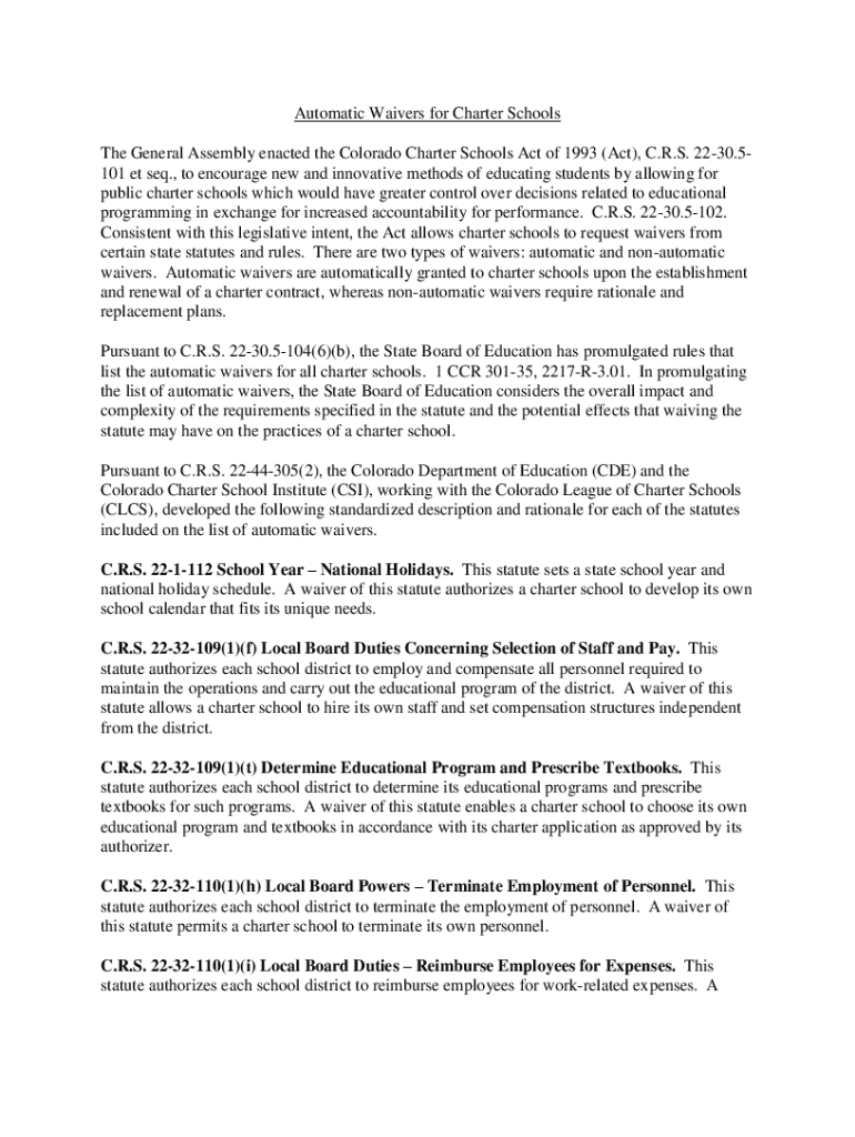 The importance of waivers lies in their potential to enhance educational flexibility. By securing waivers, charter schools can adopt specialized curricula, modify staffing requirements, or adjust student assessments, all aimed at improving educational outcomes. Common types of waivers include exemptions from specific regulations concerning funding allocation, governance, and even instructional time.