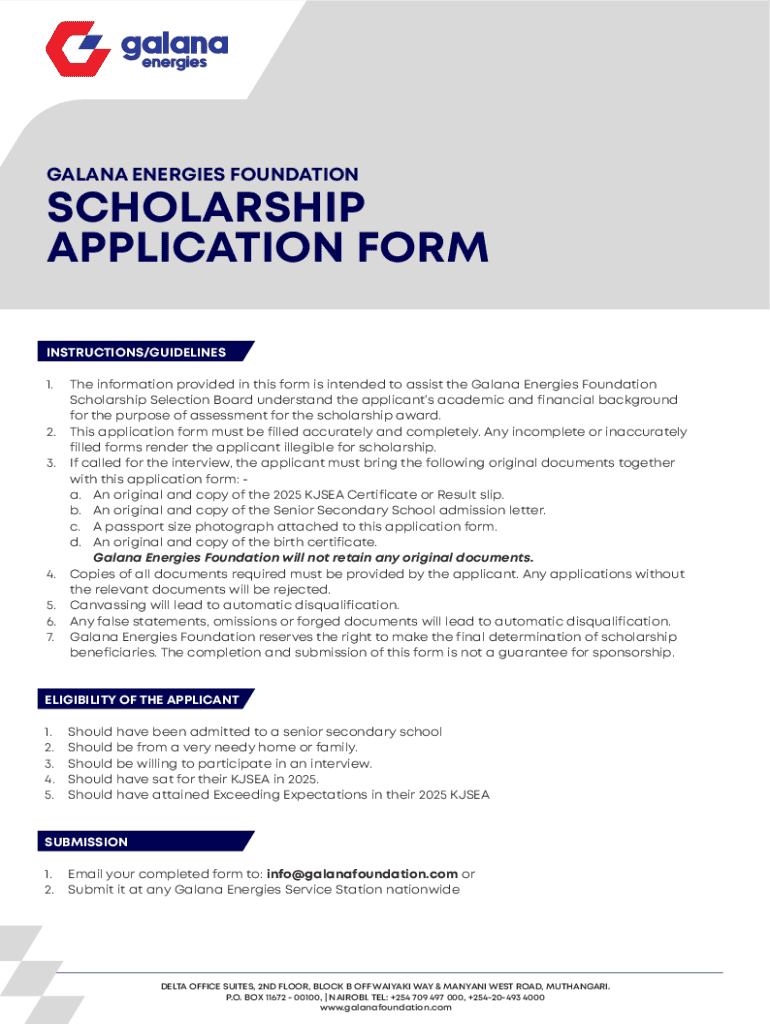 The Galana Energies Foundation is dedicated to promoting sustainable energy solutions and supporting innovative projects in this domain. With a focus on empowering communities and fostering environmentally friendly practices, the foundation acts as a catalyst for impactful initiatives. To apply for funding or support, individuals and organizations must complete the Galana Energies Foundation Form, an essential tool that allows applicants to present their projects effectively.