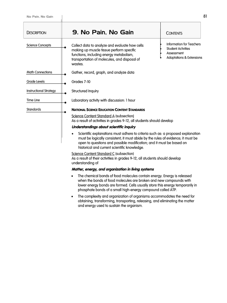 81 No Pain, No Gain DESCRIPTION 9. No Pain, No Gain Science Concepts Collect data to analyze and evaluate how cells making up muscle tissue perform specific functions, including energy metabolism,