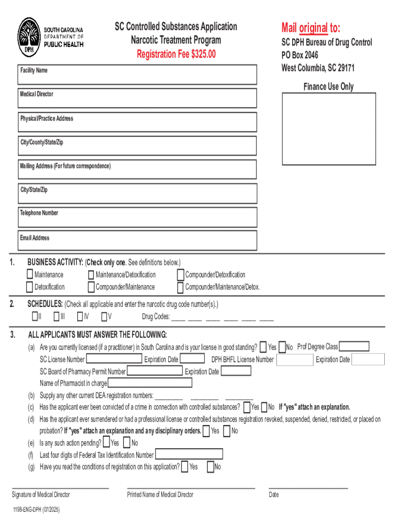 Mail original to:SC Controlled Substances Application Narcotic Treatment Program Registration Fee $325.00SC DPH Bureau of Drug Control PO Box 2046 West Columbia, SC 29171Facility NameFinance Use OnlyMedical