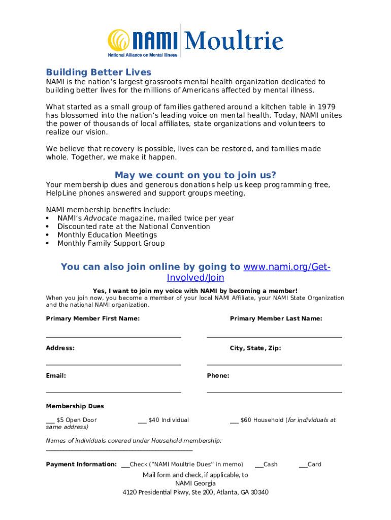 A flyer form for NAMI Moultrie membership serves as a crucial tool for simplifying the membership application process. It not only streamlines the onboarding of new members but also encourages community involvement, inviting more individuals to become part of this supportive network. By having a tangible and easy-to-use representation of the membership application, potential members can quickly grasp the steps needed to join NAMI Moultrie.