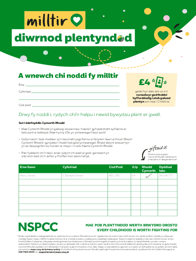A wnewch chi noddi fy milltir4Enw gallai hyn dalu am un on cwnselwyr gwirfoddol hyfforddedig i ateb galwad plentyn am help i Childline.CyfeiriadCod post Drwy fy noddi i, rydych chin helpu i newid