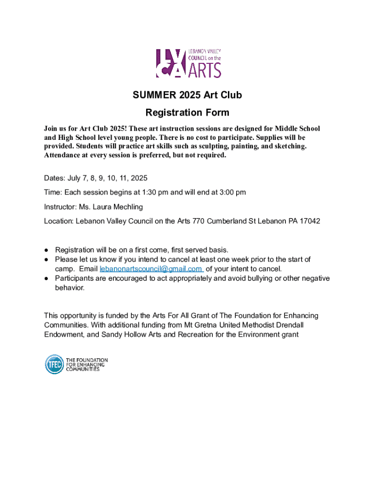 Get the free BlankRegistration Form Art Club Summer2025.docx