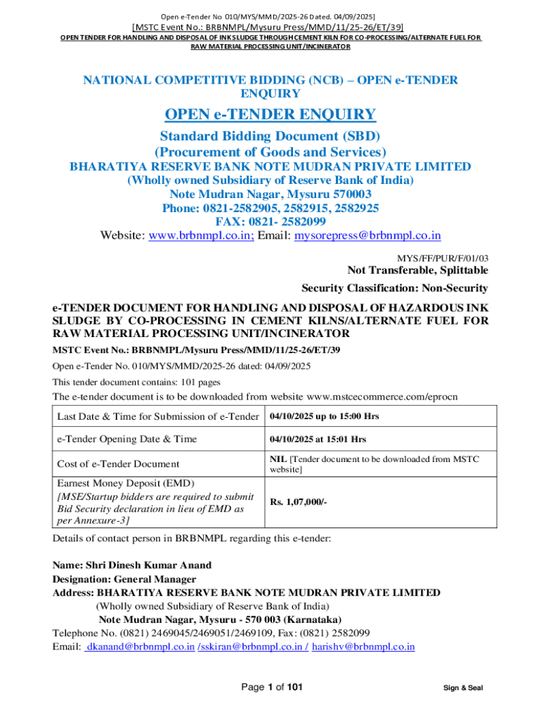 Open eTender No 010/MYS/MMD/202526 Dated. 04/09/2025][MSTC Event No.: BRBNMPL/Mysuru Press/MMD/11/2526/ET/39] OPEN TENDER FOR HANDLING AND DISPOSAL OF INK SLUDGE THROUGH CEMENT KILN FOR COPROCESSING/ALTERNATE