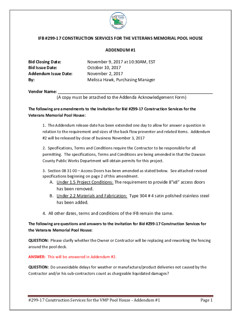 Get the free Addendum 1 Construction Services VMP Pool House. ...