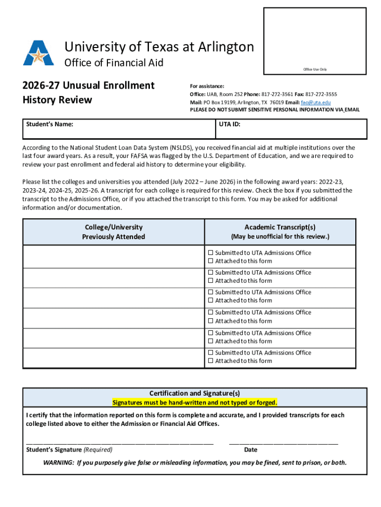 University of Texas at Arlington Office of Financial Aid 202627 Unusual Enrollment History ReviewOffice Use OnlyFor assistance: Office: UAB, Room 252 Phone: 8172723561 Fax: 8172723555 Mail: PO Box