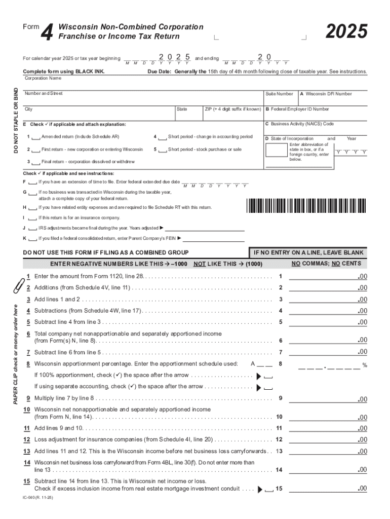 Get the free 2025 IC-040 Form 4 Wisconsin Non-Combined Corporation Franchise or Income Tax Return...