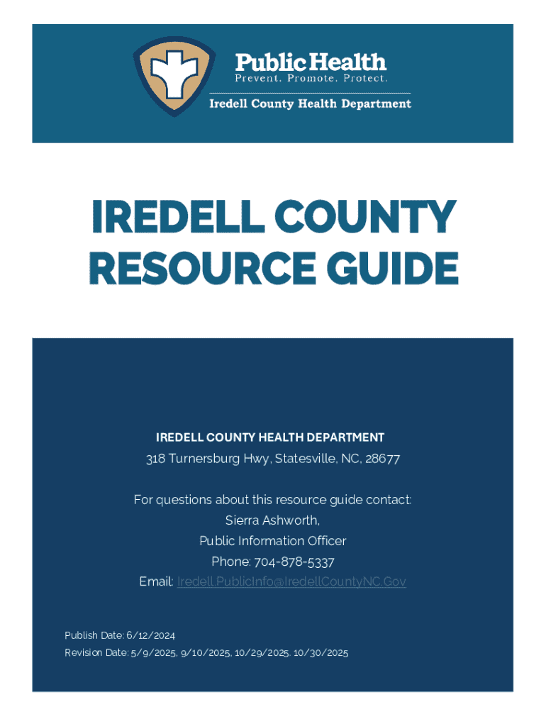 IREDELL COUNTY RESOURCE GUIDEIREDELL COUNTY HEALTH DEPARTMENT 318 Turnersburg Hwy, Statesville, NC, 28677 For questions about this resource guide contact:Sierra Ashworth, Public Information Officer