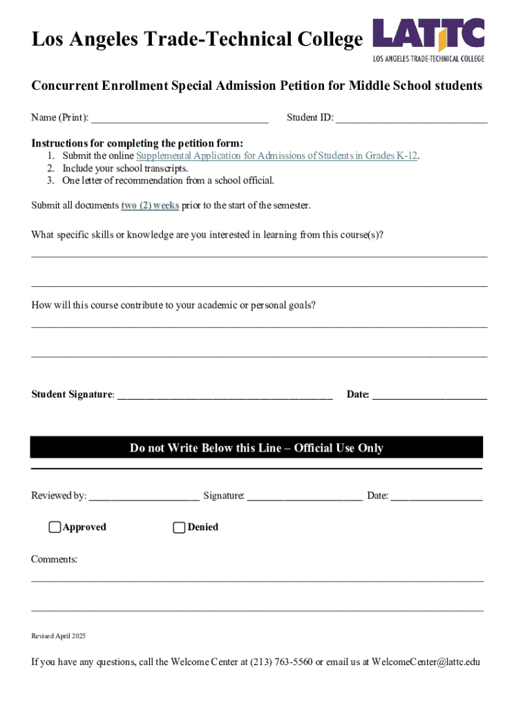 Los Angeles TradeTechnical College Concurrent Enrollment Special Admission Petition for Middle School students Name (Print): ___Student ID: ___Instructions for completing the petition form:1. Submit
