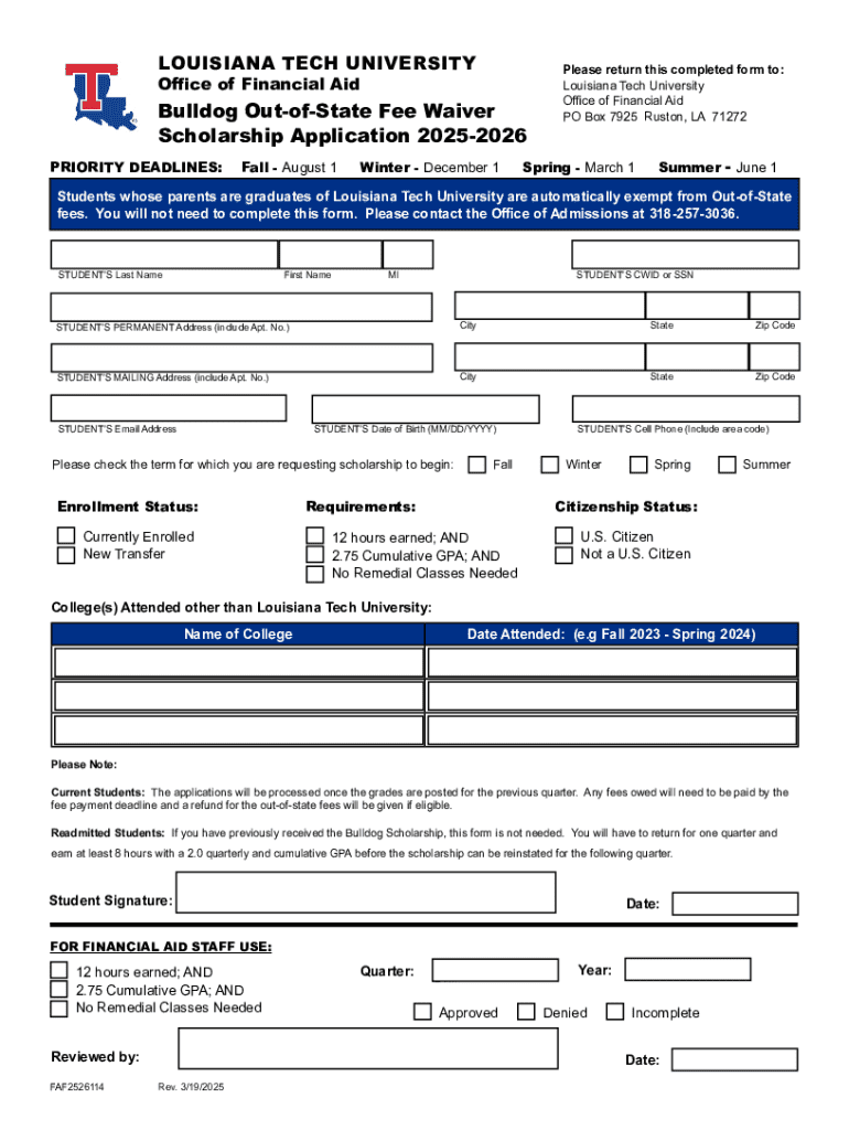 Completing the LTU Bulldog Out-of-State Fee Form can be a straightforward process if approached systematically. This guide outlines the necessary steps to ensure everything is filled out correctly and efficiently. Following these steps meticulously will minimize errors and expedite processing times.