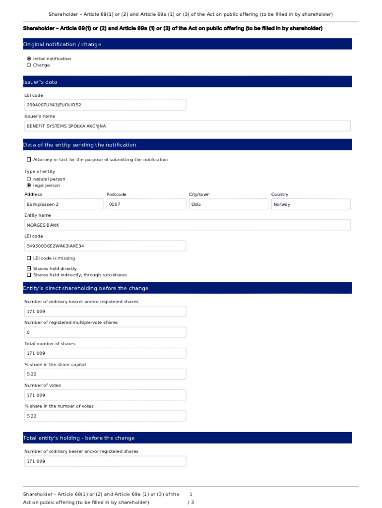 ShareholderArticle 69(1) or (2) and Article 69a (1) or (3) of the Act on public offering (to be filled in by shareholder)ShareholderArticle 69(1) or (2) and Article 69a (1) or (3) of the Act on public