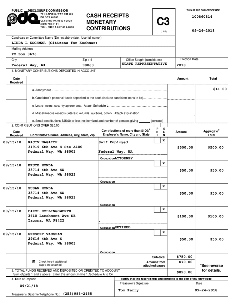 PUBLICTHIS SPACE FOR OFFICE USEDISCLOSURE COMMISSION 711 CAPITOL WAY RM 206 PO BOX 40908 OLYMPIA WA 985040908 (360) 7531111 TOLL FREE 18776012828C3CASH RECEIPTS MONETARY CONTRIBUTIONS10086081409242018(1/02)Candidate