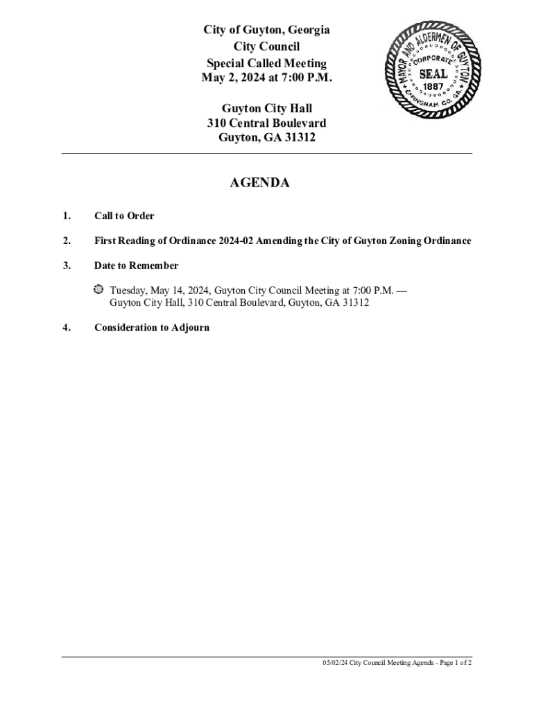 City of Guyton, Georgia City Council Special Called Meeting May 2, 2024 at 7:00 P.M. Guyton City Hall 310 Central Boulevard Guyton, GA 31312AGENDA 1.Call to Order2.First Reading of Ordinance 202402