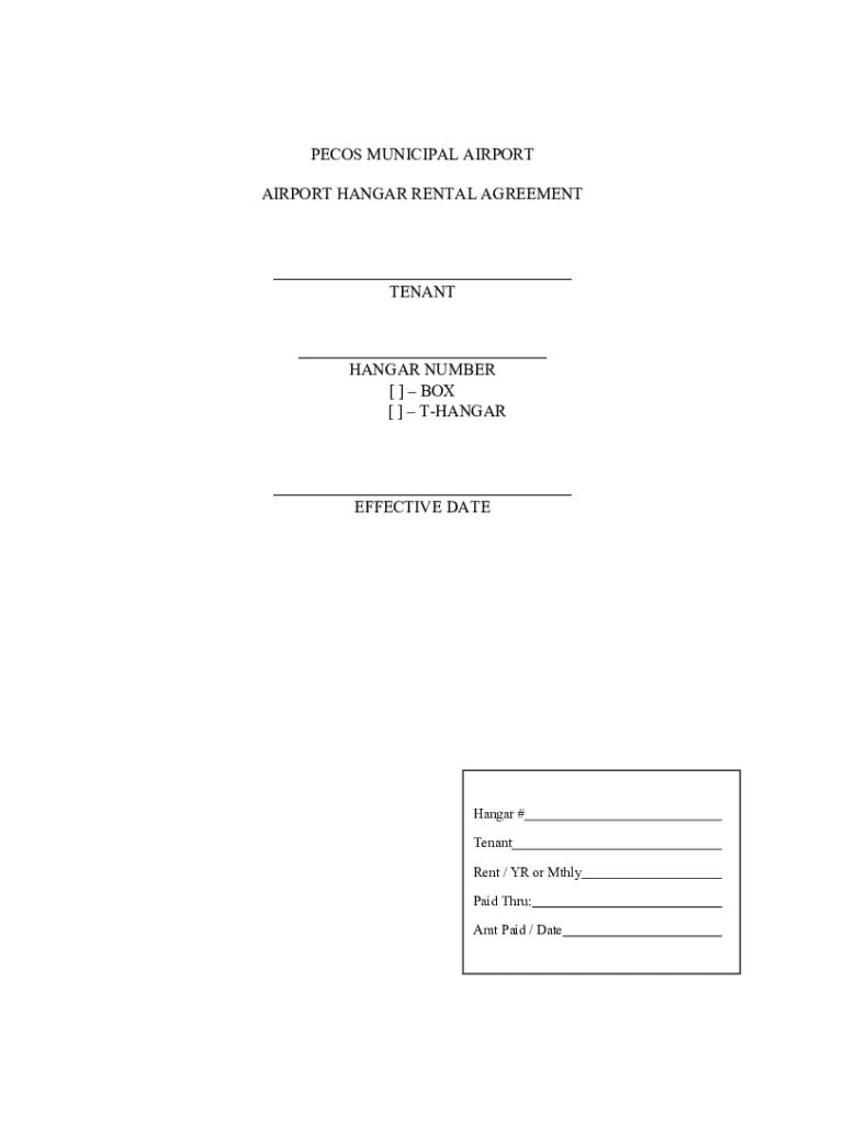 PECOS MUNICIPAL AIRPORT AIRPORT HANGAR RENTAL AGREEMENTTENANTHANGAR NUMBER [ ]BOX [ ]THANGAREFFECTIVE DATEHangar # Tenant Rent / YR or Mthly Paid Thru: Amt Paid / DateThe Town of Pecos City, a municipal