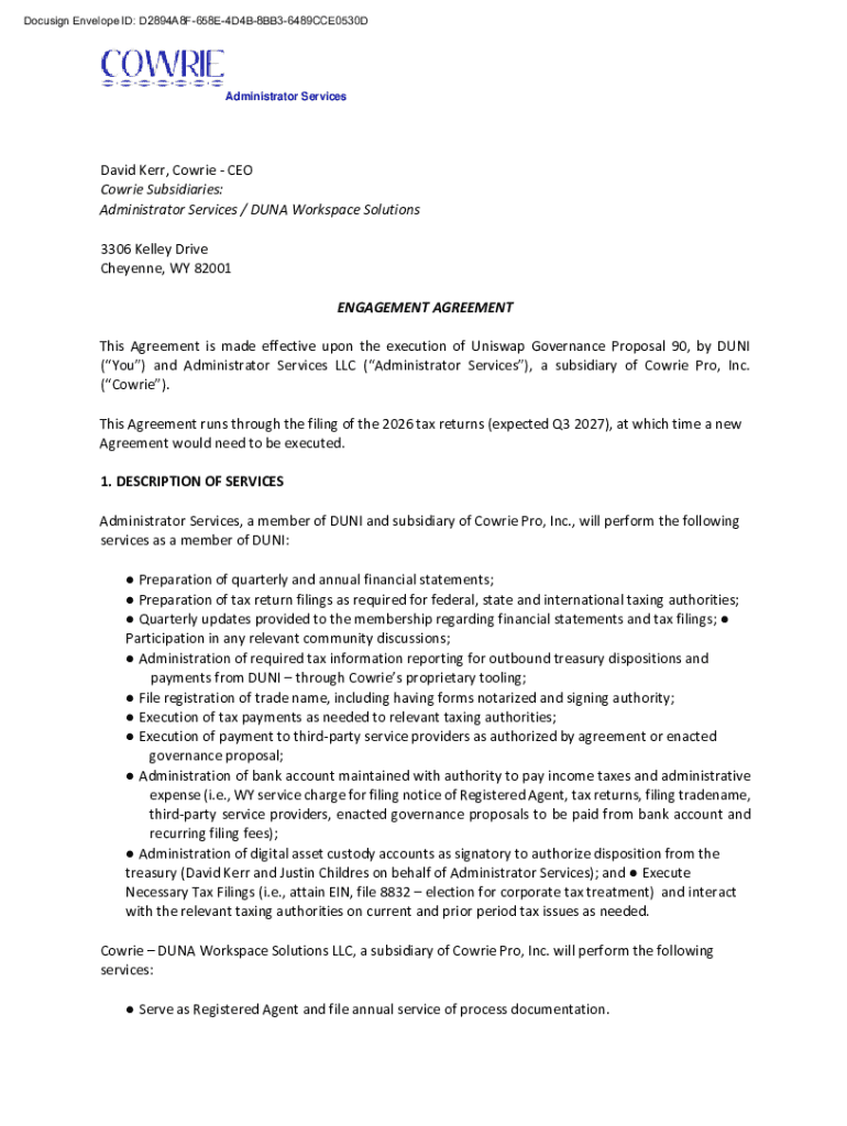 Docusign Envelope ID: D2894A8F658E4D4B8BB36489CCE0530DAdministrator ServicesDavid Kerr, CowrieCEO Cowrie Subsidiaries: Administrator Services / DUNA Workspace Solutions 3306 Kelley Drive Cheyenne,