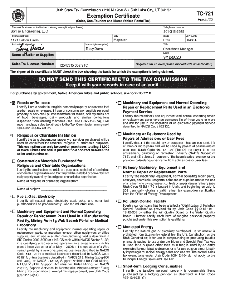 Get the free TC-721, Utah Sales Tax Exemption Certificate copy