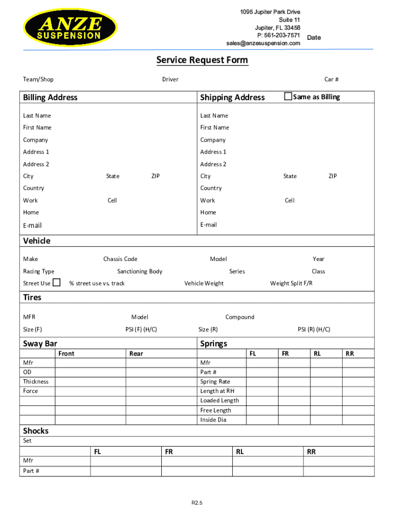 1095 Jupiter Park Drive Suite 11 Jupiter, FL 33458 P: 5612037571 sales@anzesuspension.comDateService Request Form Team/ShopDriverCar #Billing AddressShipping AddressLast NameLast NameFirst NameFirst