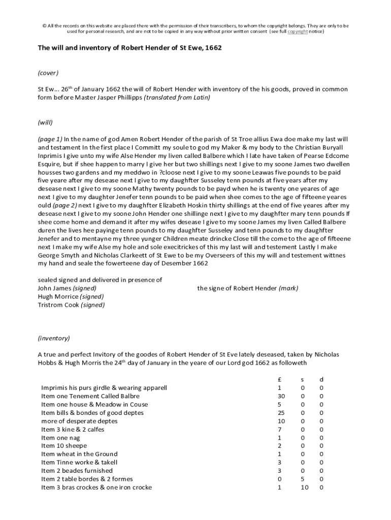 Get the free The will and inventory of Robert Hender of St Ewe, 1662