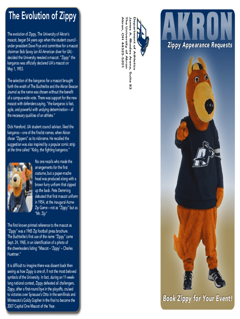 The evolution of Zippy, The University of Akrons mascot, began 54 years ago when the student council under president Dave Frye and committee for a mascot chairman Bob Savoy (an AllAmerican diver for