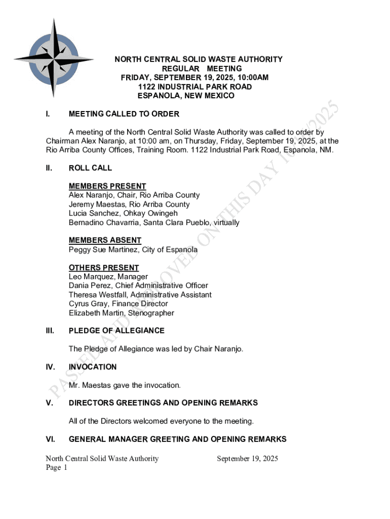 NORTH CENTRAL SOLID WASTE AUTHORITY REGULAR MEETING FRIDAY, SEPTEMBER 19, 2025, 10:00AM 1122 INDUSTRIAL PARK ROAD ESPANOLA, NEW MEXICO I.MEETING CALLED TO ORDERA meeting of the North Central Solid