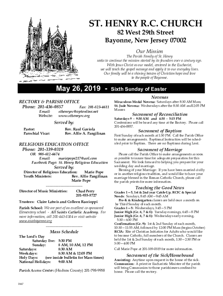 ST. HENRY R.C. CHURCH 82 West 29th Street Bayonne, New Jersey 07002 Our MissionThe Parish Family of St. Henry seeks to continue the mission started by its founders over a century ago. With Jesus Christ