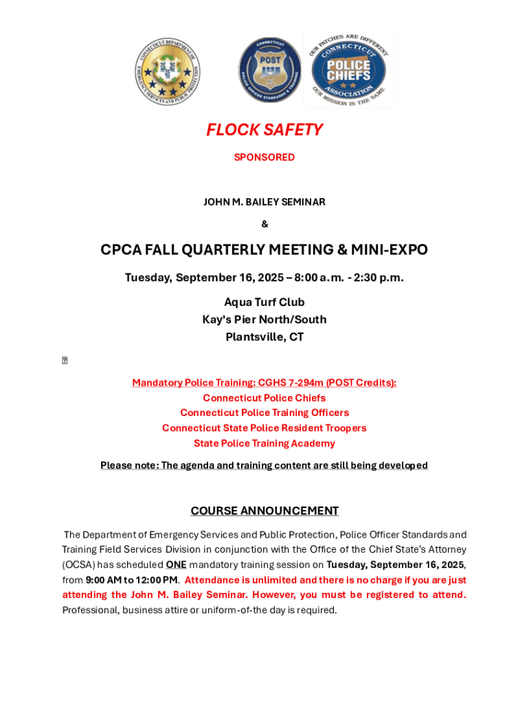 FLOCK SAFETY SPONSOREDJOHN M. BAILEY SEMINAR &CPCA FALL QUARTERLY MEETING & MINIEXPO Tuesday, September 16, 20258:00 a.m.2:30 p.m. Aqua Turf Club Kays Pier North/South Plantsville, CTMandatory Police