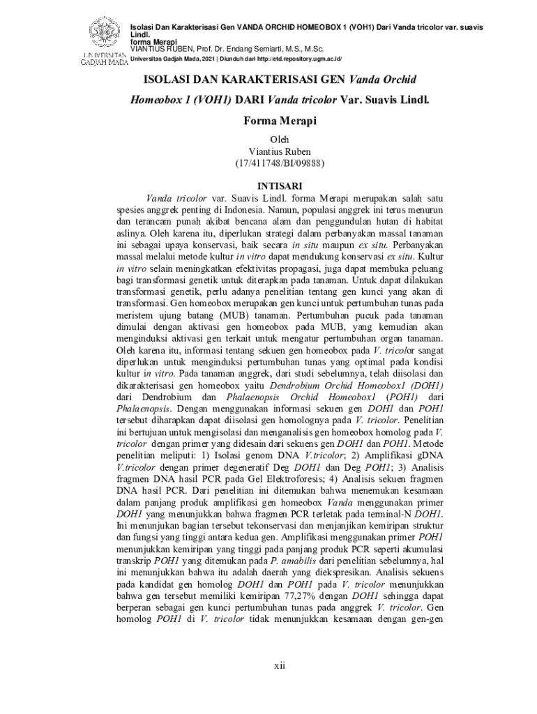 Isolasi Dan Karakterisasi Gen VANDA ORCHID HOMEOBOX 1 (VOH1) Dari Vanda tricolor var. suavis Lindl. forma Merapi VIANTIUS RUBEN, Prof. Dr. Endang Semiarti, M.S., M.Sc. Universitas Gadjah Mada, 2021