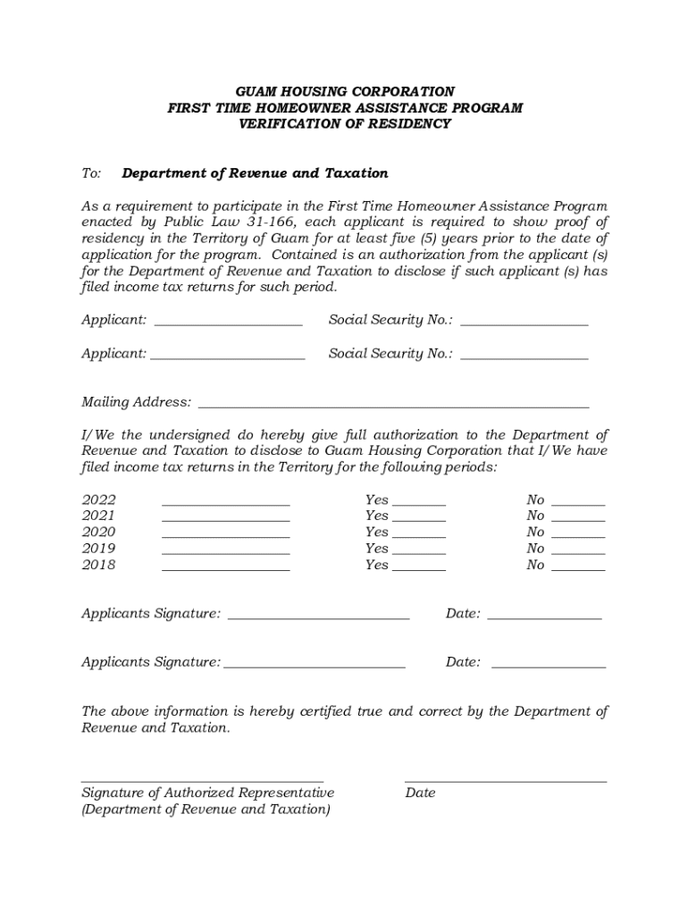 GUAM HOUSING CORPORATION FIRST TIME HOMEOWNER ASSISTANCE PROGRAM VERIFICATION OF RESIDENCY To:Department of Revenue and TaxationAs a requirement to participate in the First Time Homeowner Assistance