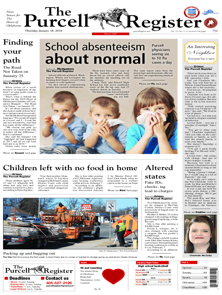 HOKL APurcellRegisterThursday, January 18, 2018Finding your pathSince 1887purcellregister.comSchool absenteeismabout normalThe Road Not Taken on January 25John D. Montgomery The Purcell Register School