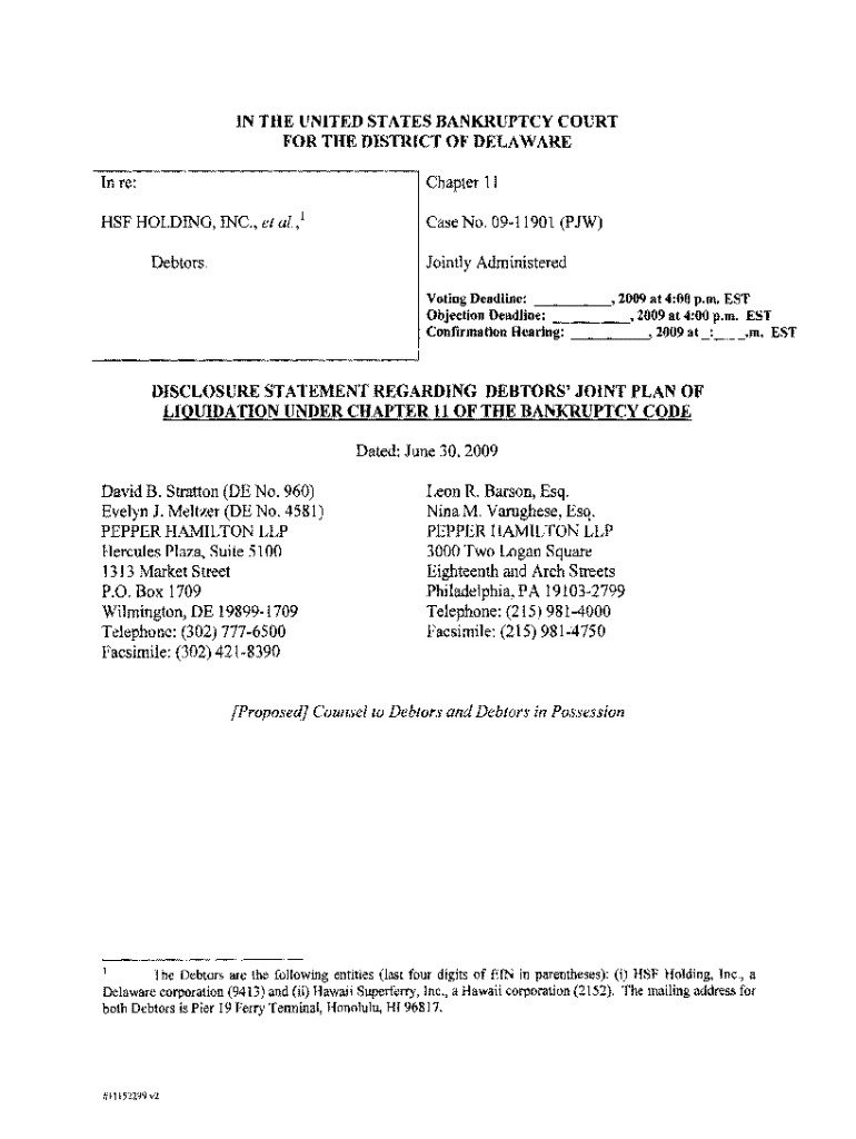 IN THE UNITED STATES BANKRUPTCY COURT FOR THE DISTRICT OF DELAWAREIn re:Chapter 11HSF HOLDING, INC., et at.,lCase No. 0911901 (PJW)Debtors.Jointly Administered Voting Deadline: _ _ _ _,2009 at 4:00