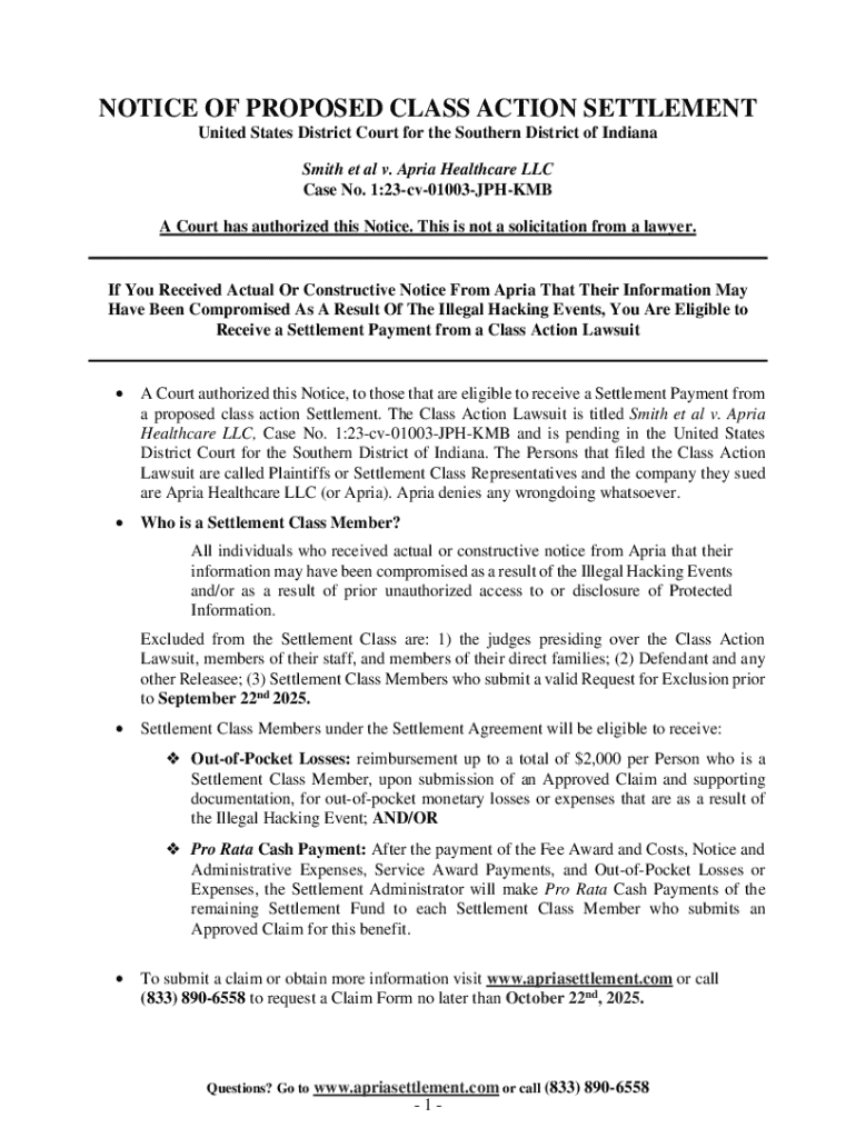NOTICE OF PROPOSED CLASS ACTION SETTLEMENT United States District Court for the Southern District of Indiana Smith et al v. Apria Healthcare LLC Case No. 1:23cv01003JPHKMB A Court has authorized this