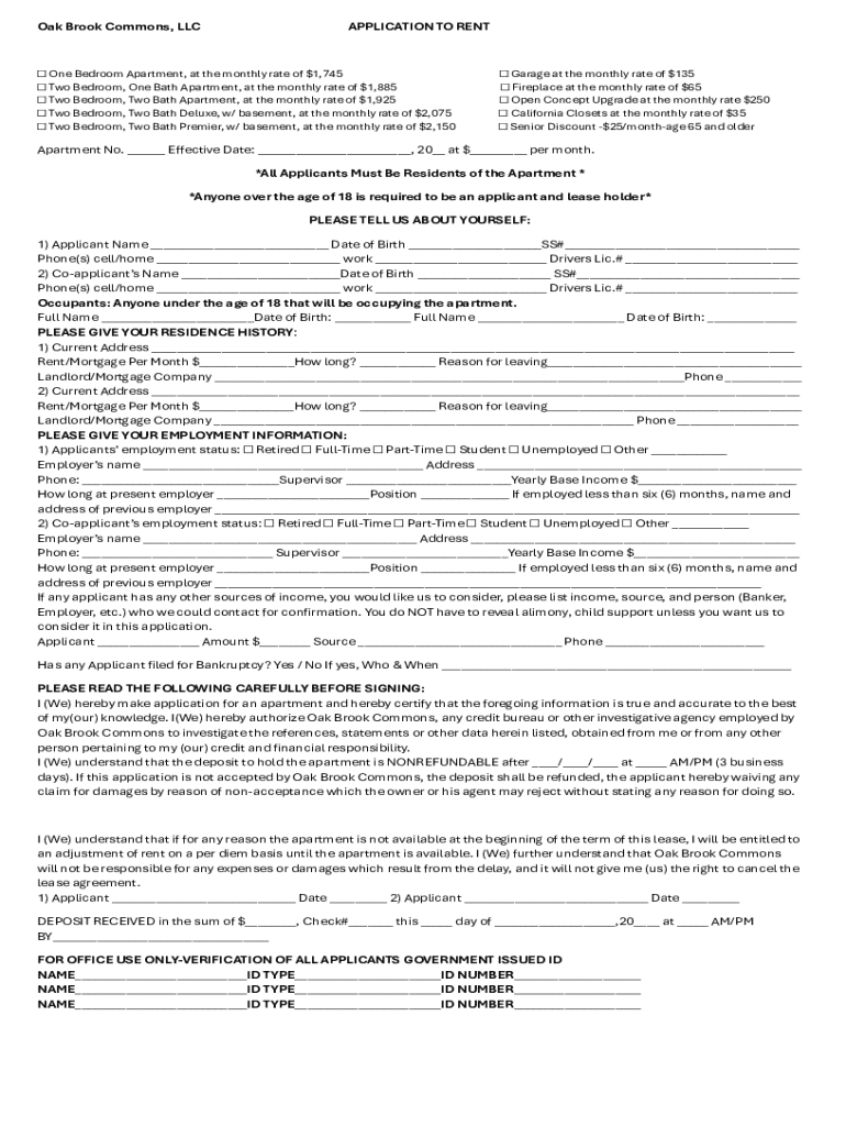 Get the free Oak Brook Commons, LLC APPLICATION TO RENT Apartment No ...