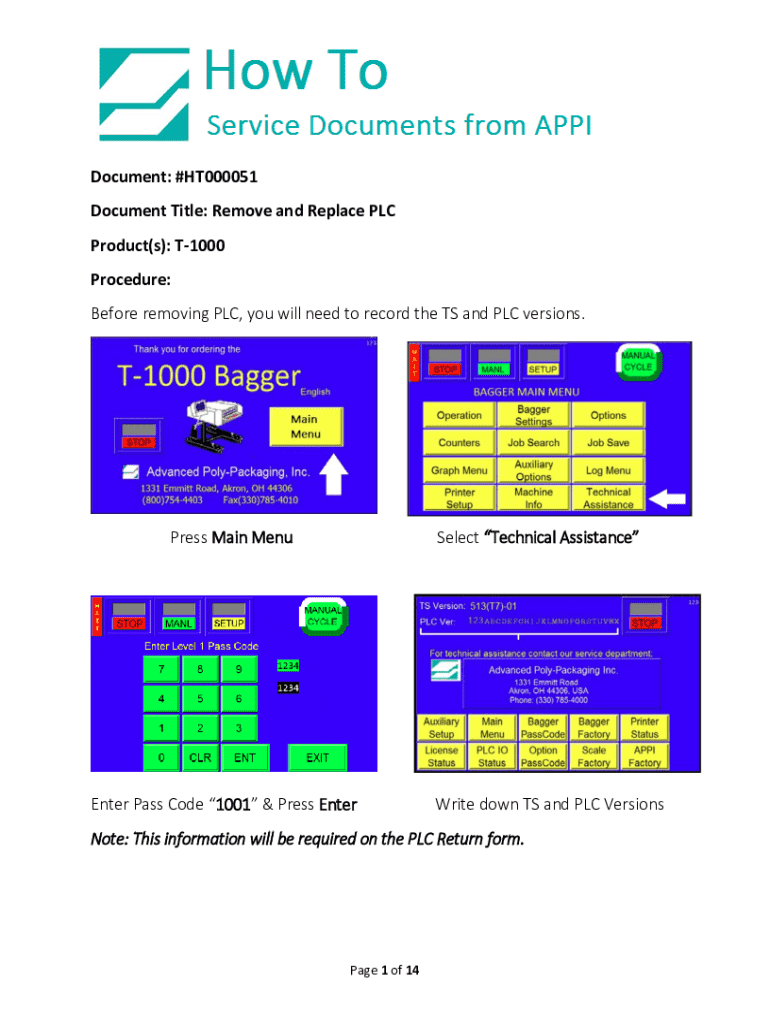 Document: #HT000051 Document Title: Remove and Replace PLC Product(s): T1000 Procedure: Before removing PLC, you will need to record the TS and PLC versions.Press Main MenuSelect Technical AssistanceEnter