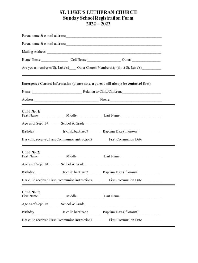 ST. LUKES LUTHERAN CHURCH Sunday School Registration Form 20222023 Parent name & email address:___ Parent name & email address:___ Mailing Address: ___ Home Phone:___ Cell Phone:___ Other: ___ Are