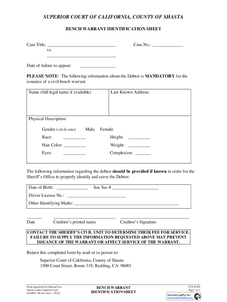 Get the free BENCH WARRANT IDENTIFICATION SHEET