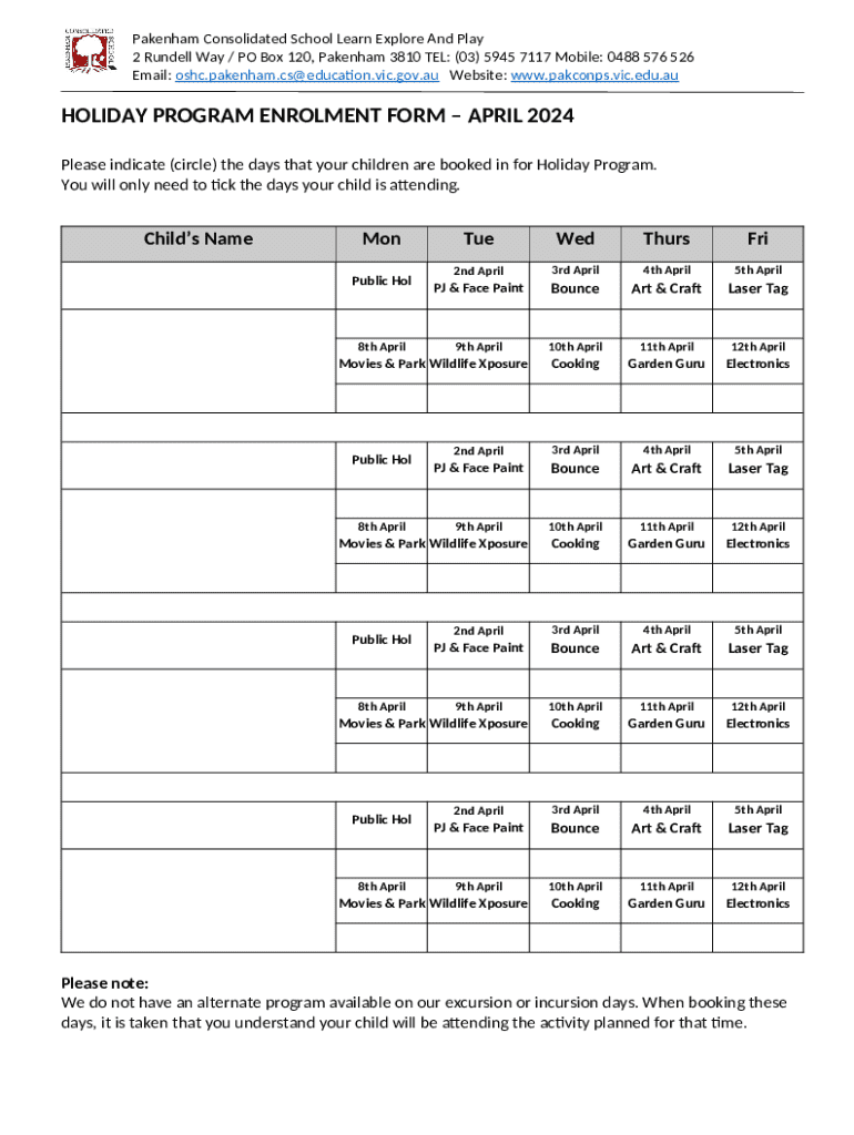 Instructions for the form Final Holiday Program - Enrolment Consent