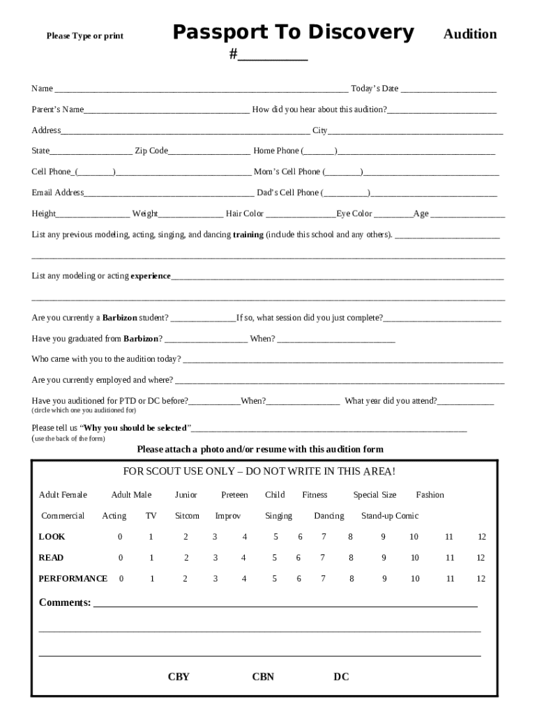 The template includes designated fillable fields for personal and audition-specific information, making data entry straightforward.