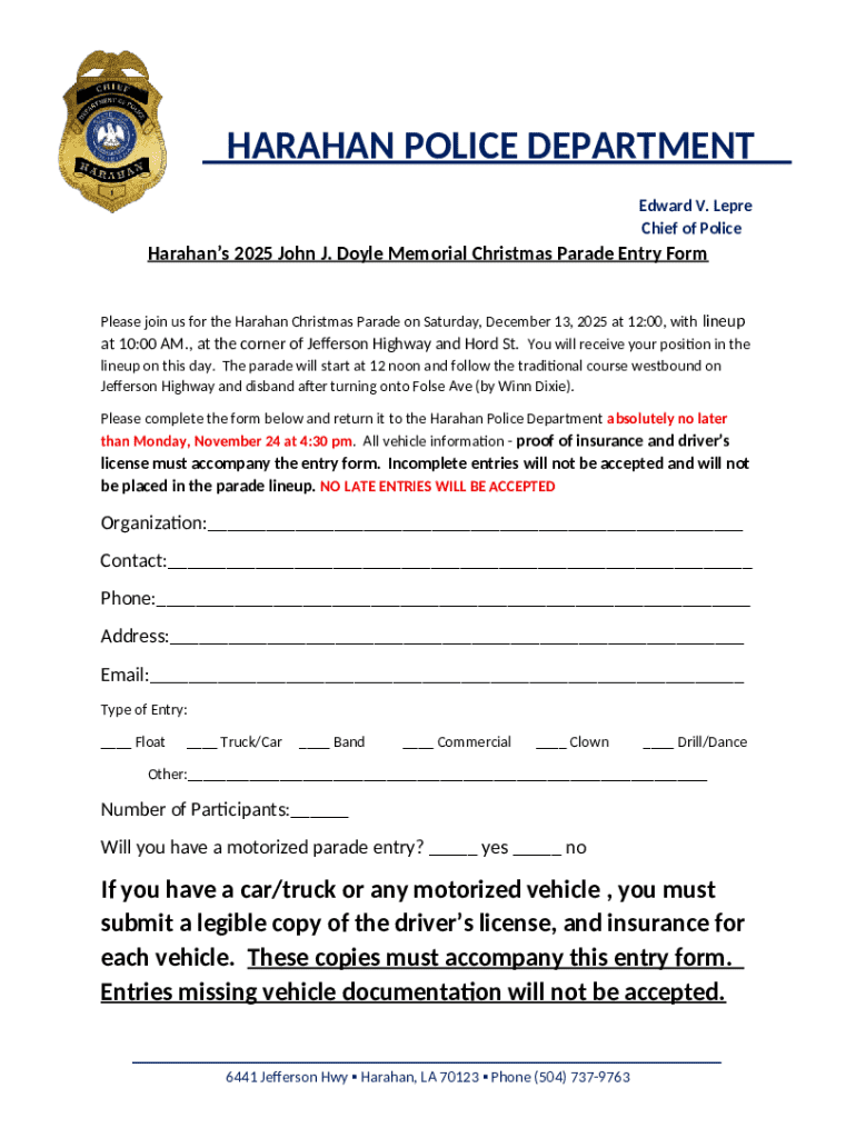 The Harahan Police Department template form serves as a crucial document for residents of Harahan, Louisiana, designed to facilitate the reporting of incidents and interactions with local law enforcement. This form is integral to the communication process between citizens and the police department, ensuring that necessary information is accurately conveyed and documented. Comprehensive understanding of local law enforcement forms, such as the Harahan Police Department template form, is essential for residents to effectively navigate the justice system and protect their rights. Use cases for the form include reporting crimes, filing complaints, and providing necessary information during investigations.