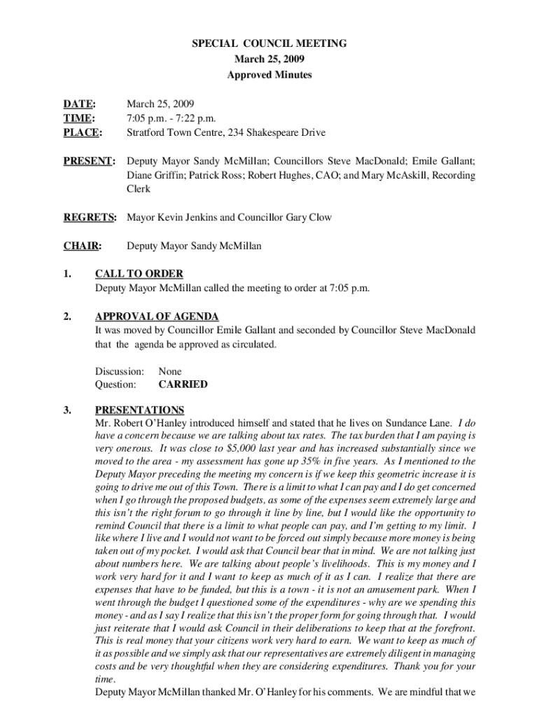 SPECIAL COUNCIL MEETING March 25, 2009 Approved Minutes DATE: TIME: PLACE:March 25, 2009 7:05 p.m.7:22 p.m. Stratford Town Centre, 234 Shakespeare DrivePRESENT:Deputy Mayor Sandy McMillan; Councillors
