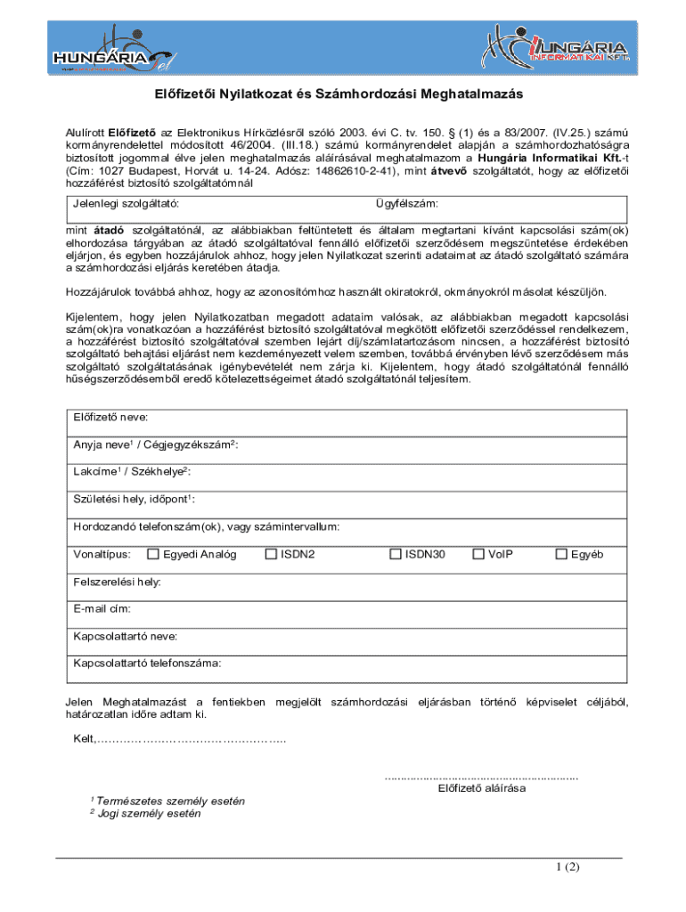 Elfizeti Nyilatkozat s Szmhordozsi Meghatalmazs Alulrott Elfizet az Elektronikus Hrkzlsrl szl 2003. vi C. tv. 150.(1) s a 83/2007. (IV.25.) szm kormnyrendelettel mdostott 46/2004. (III.18.) szm kormnyrendelet