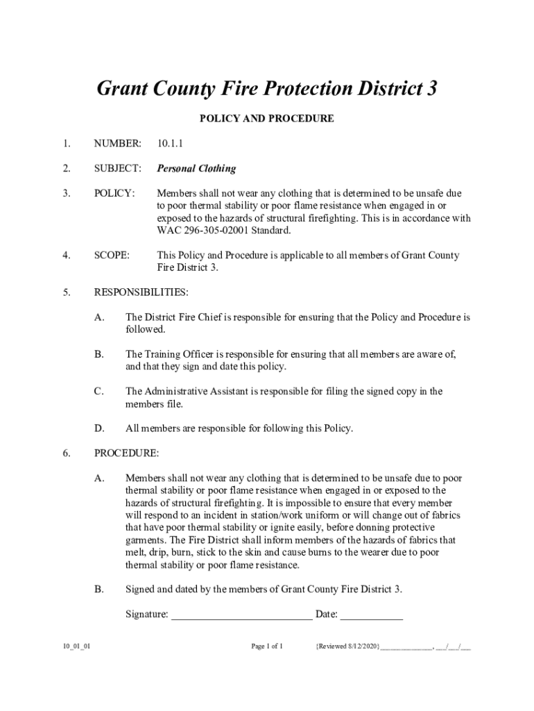 Grant County Fire Protection District 3 POLICY AND PROCEDURE 1.NUMBER:10.1.12.SUBJECT:Personal Clothing3.POLICY:Members shall not wear any clothing that is determined to be unsafe due to poor thermal